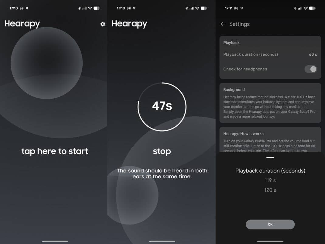 Essentially, the app plays a continuous sine wave precisely tuned to 100 kHz for 60 seconds, though there is a setting to adjust the duration to 120 seconds. By listening to this audio through your headphones, you help balance the vestibular system, which is associated with nerves and sensory organs responsible for detecting balance and motion. The audio helps alleviate the mismatch in system inputs that typically causes motion sickness, subsequently reducing nausea and other related symptoms.