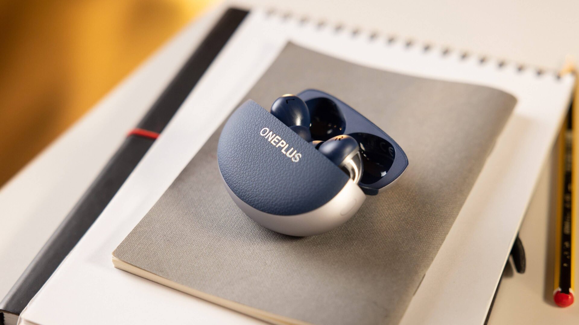 OnePlus Buds Pro 3 charging case on a notebook with a pencil.